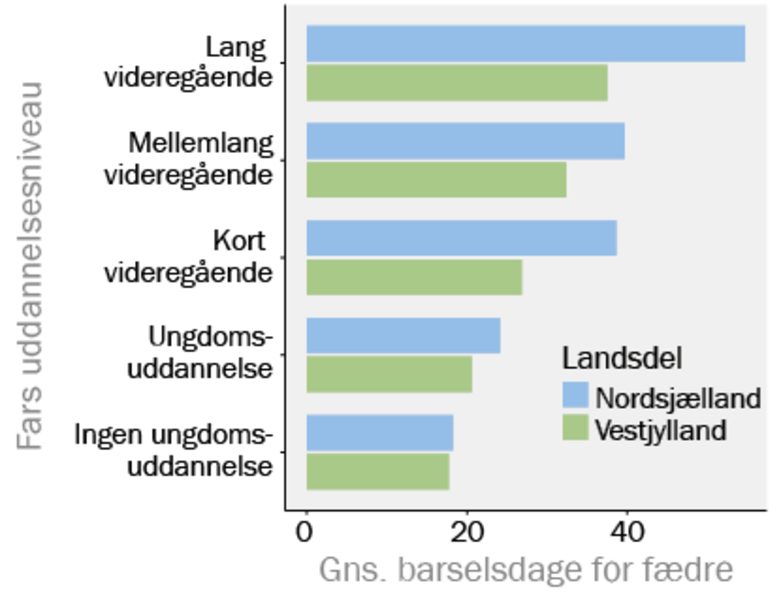 Det gennemsnitlige antal barselsdage for fædre indenfor forskellige uddannelsesniveauer viser en voldsom forskel (figur 1). Fædre uden ungdomsuddannelse holder i gennemsnit under 20 dages barsel, mens fædre med en lang videregående uddannelse holder mere end 50 dages barsel i gennemsnit – altså over 2,5 gange så meget. Der er et tydeligt billede af, at højere uddannelsesniveau resulterer i mere fædrebarsel. En matematisk model, som tager højde for fædrenes uddannelsesniveau, forklarer hele 70% af variationen – altså kan cirka 70% af, hvor meget barsel mænd i gennemsnit holder, forklares alene ud fra deres uddannelsesniveau.