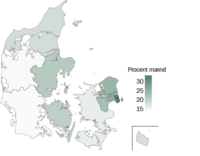 Ydermere kan vi se, at der er stor forskel på fordelingen af ansatte i de forskellige brancher på tværs af landsdelene (se figur 6 og 7). I landsdele med få barselsdage er procentdelen af mænd i brancher med kort barsel stor. Modsat er procentdelen af mænd i brancher med et højt antal barselsdage stor i de landsdele med et højt antal barselsdage. Dette underbygger den store effekt af branche på fædrebarsel.