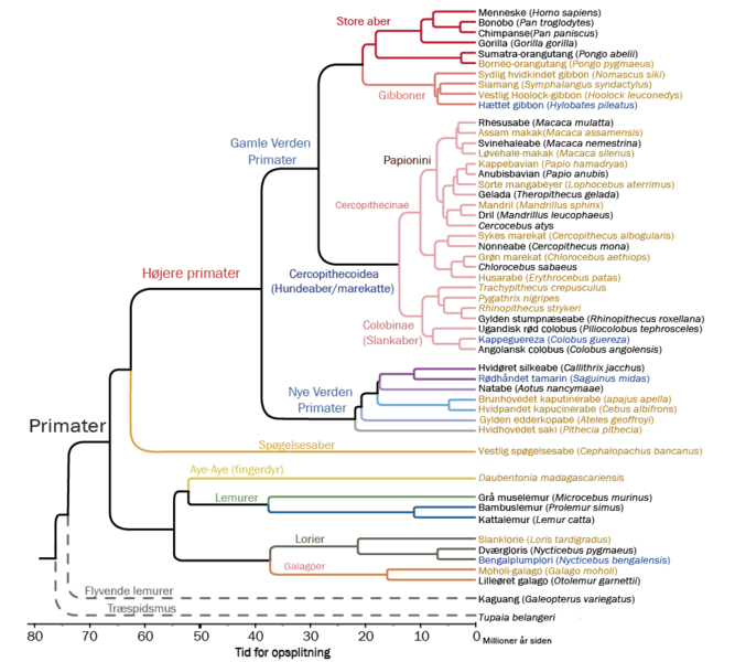 Gibbonaberne delte en fælles forfader med mennesker for omkring 20 millioner år siden. På trods af, at vi er splittet fra de andre menneskeaber for mange millioner år siden år siden, er vi fortsat næsten identiske. Mennesket deler mellem 98 og 99 % af vores DNA-sekvens med vores nærmeste nulevende slægtninge på det evolutionære stamtræ. Siden splittet fra orangutangerne har mennesket udviklet sig til en bred vifte af forskellige arter, som med tiden er uddøde alle sammen på nær os.