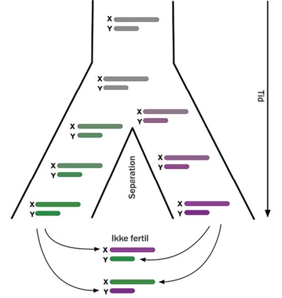 Figuren illustrerer den overordnede hypotese, som Mikkel Schierup arbejder med, at konkurrence mellem kønskromosomerne i dannelsen af sædcellerne kan være en vigtig spiller i artsdannelse. Hvis der sker en geografisk opsplitning i en arts udbredelse vil udviklingen af X- og Y-kromosomerne på grund af den indbyrdes konkurrencesituation kunne føre til, at de geografisk adskilte populationer ikke længere vil matche og få fertilt afkom, hvis de igen bliver ført sammen.