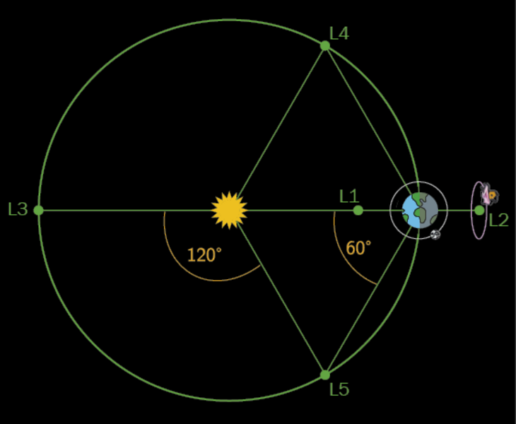 For det første er teleskopet blevet bortvist til et særligt område 1,5 millioner kilometer væk fra Jorden, fire gange så langt væk som Månen og i retning væk fra Solen. Normalt ville denne længere afstand til Solen betyde, at teleskopets kredsløb om Solen ville tage længere tid end Jorden (5½ dage længere per år), men lige præcis i denne afstand giver den ekstra tyngdekraft fra Jorden teleskopet et lille boost, der får dem til at følges ad. Dette særlige område kaldes Langrange-punkt 2, opkaldt efter franskmanden Joseph-Louis Lagrange (1736–1813).