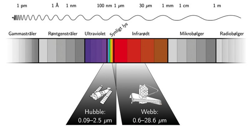 Det elektromagnetiske spektrum strækker sig fra kortbølgede og energirige gammastråler over det synlige lys og ud til de langbølgede og energisvage radiobølger. Hvor Hubble kun lige titter udenfor det synlige spektrum — fra