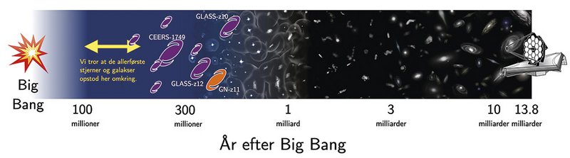 Efter redaktionens afslutning fik vi endelig den længe ventede spektroskopiske bekræftelse af en rekordfjern galakse, døbt JADES-GS-z13-0, som ses helt tilbage da Universet var 320 millioner år gammelt (omend studiet endnu ikke er accepteret til publikation). Indenfor de nærmeste år vil denne rekord utvivlsomt blive slået indtil flere gange. Det er en spændende tid, vi lever i! ♦