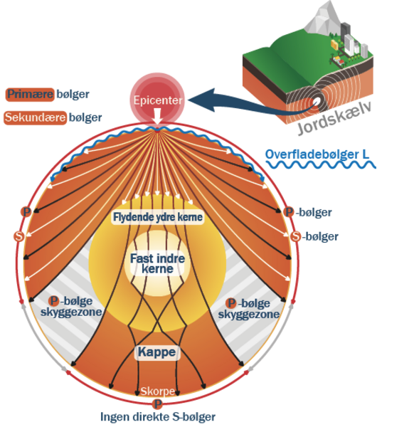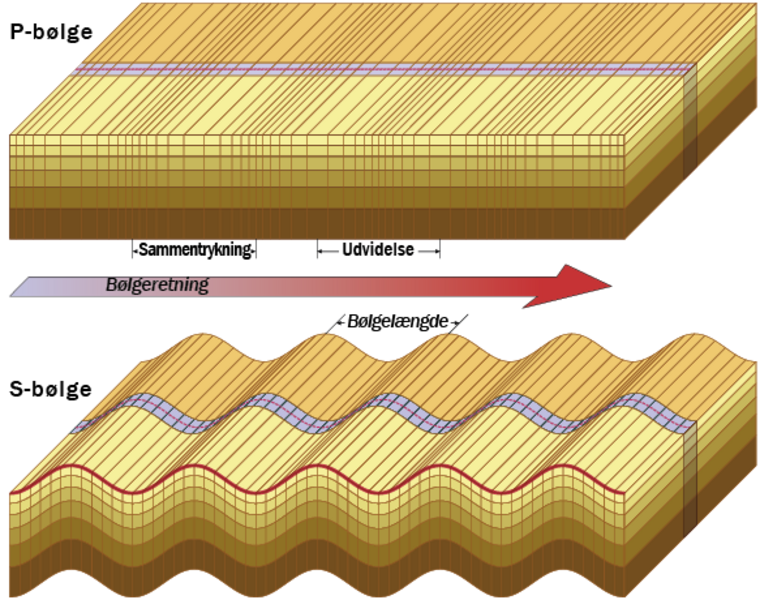 Bølgerne fra store jordskælv breder sig igennem Jorden som tredimensionelle ringe i vandet. Der er to grundlæggende forskellige bølger. P-bølger, der udbreder sig ved at trække i og trykke på klippen som en harmonika, og S-bølger, der udbreder sig ved bølgebevægelser, som i et sjippetov, der viftes op og ned.