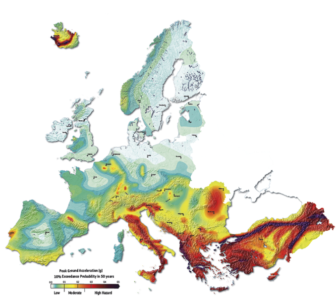 Farverne på kortet beskriver parameteren Peak Ground Acceleration (PGA), altså hvor voldsomt jorden kan bevæge sig. PGA er en god indikator for, hvor store skader et skælv medfører. De værdier, der er afbildet på kortet, når helt op over 0,5 g, hvor 1 g er tyngdeaccelerationen på jordens overflade. På kortet er områder med lav risiko farvet i hvid til grøn, områder med moderat risiko er farvet i gul til orange, og områder med høj risiko er farvet i mørkerød til lilla. Ifølge EFEHR er Tyrkiet, Grækenland, Albanien, Italien og Rumænien landene med den største risiko i Europa, efterfulgt af de resterende Balkanlande. Se mere på www.efehr.org