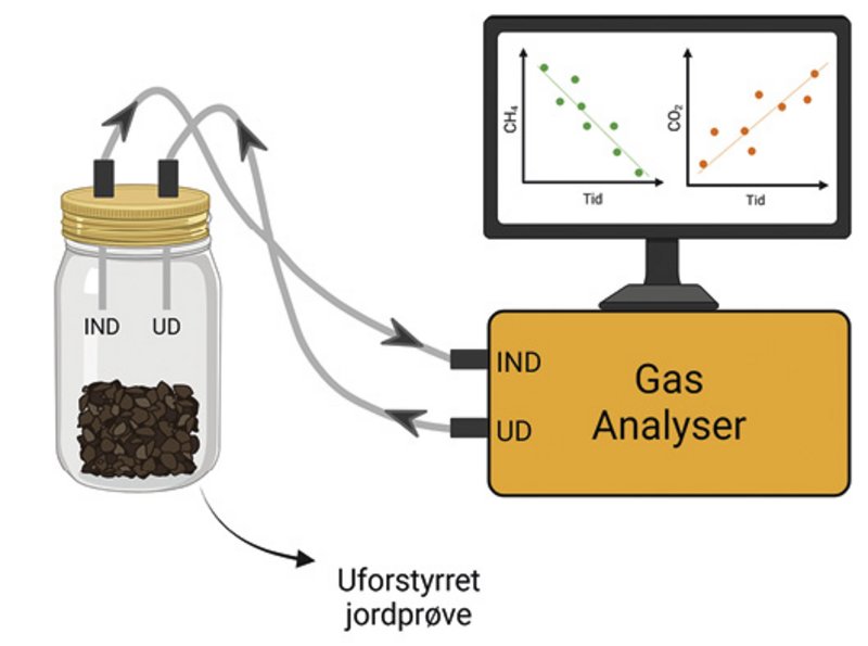 I laboratoriet måles på intakte prøver fra Grønland. En konstant luftstrøm sendes mellem glas med prøve og et apparat, der kan analysere koncentrationen af methan og carbondioxid (CO2). Her måles udviklingen af gaskoncentrationerne over tid, som kan omregnes til dels en produktion af carbondioxid (CO2) og dels et optag af methan (CH4) i prøven.