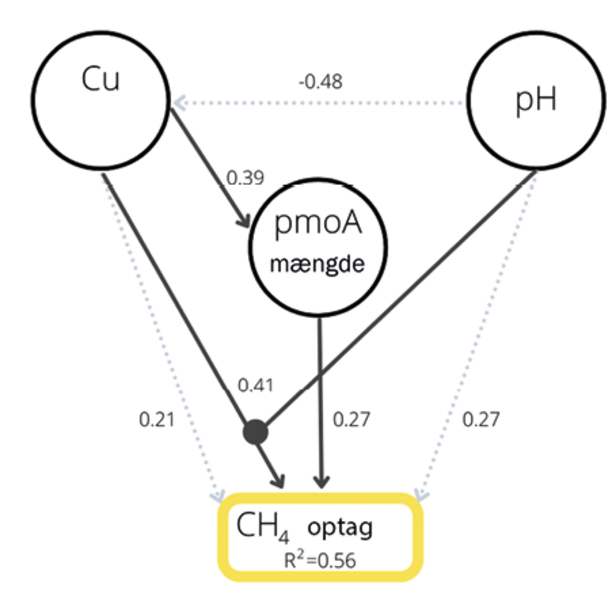 Parameteren pmoA (particulate methane monooxygenase) er et udtryk for mængden af et funktionelt gen, som er karakteristisk for den gruppe af mikroorganismer, der nedbryder methan. Cu (kobber) er den biologisk tilgængelige mængde målt i jorden, og pH er jordens surhedsgrad. For CH4-optag angiver R2-værdien, hvor godt optaget af methan er forklaret ved en kombination af målte værdier af Cu, pmoA og pH. Hvor 0 er ingen forklaringsgrad og 1 er 100 % forklaringsgrad.