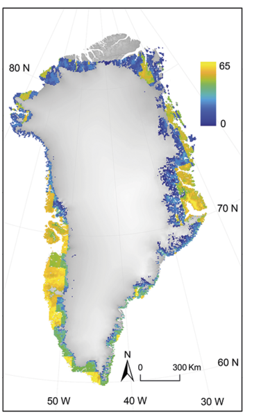 Kortet over Grønland viser med farver det gennemsnitlige methanoptag for den isfrie del af Grønland for perioden 2000-2016 med enheden mg CH4 per m2 per måned. Modellen inkluderer ikke den nordligste del af Grønland (nord for den 82. grader nordlige breddegrad), fordi der her mangler en klassifikation af overfladen.