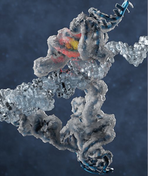 Billedet viser RNA-kopimaskinen (et såkaldt RNA-polymerase-ribozym), som den er blevet afsløret ved hjælp af cryo-elektronmikroskopi. RNA- kopimaskinen er vist med en kappe af is omkring sig for at symbolisere, at den fungerer bedst under iskolde forhold. Det område i RNA-molekylet, hvor kopieringen udføres – molekylets motor – er vist som gult/rødt lys, og molekylet balancerer på en gennemsigtig RNA-streng, der bliver kopieret.