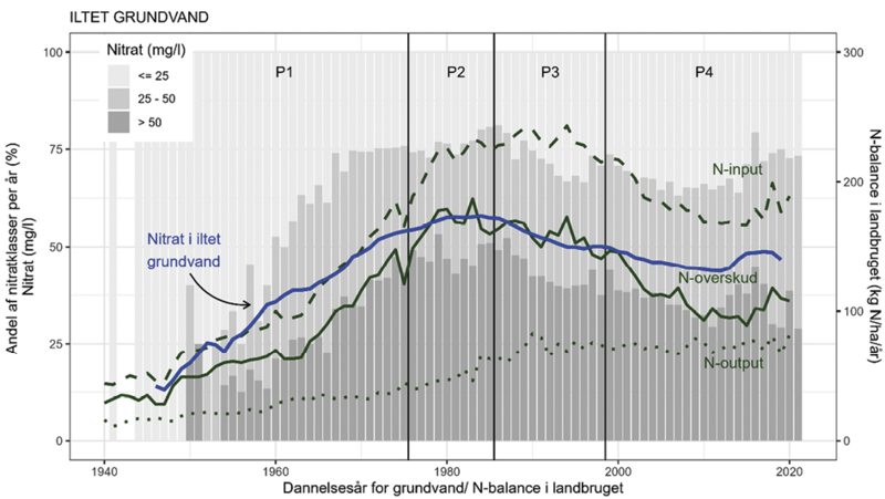 I periode P1 stiger nitratindholdet fortsat, i periode P2 er indholdet meget højt og konstant, i periode P3 falder indhold, og i periode P4 faldet indholdet først for siden at stige frem mod i dag.
