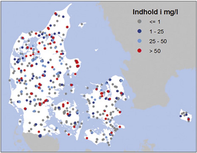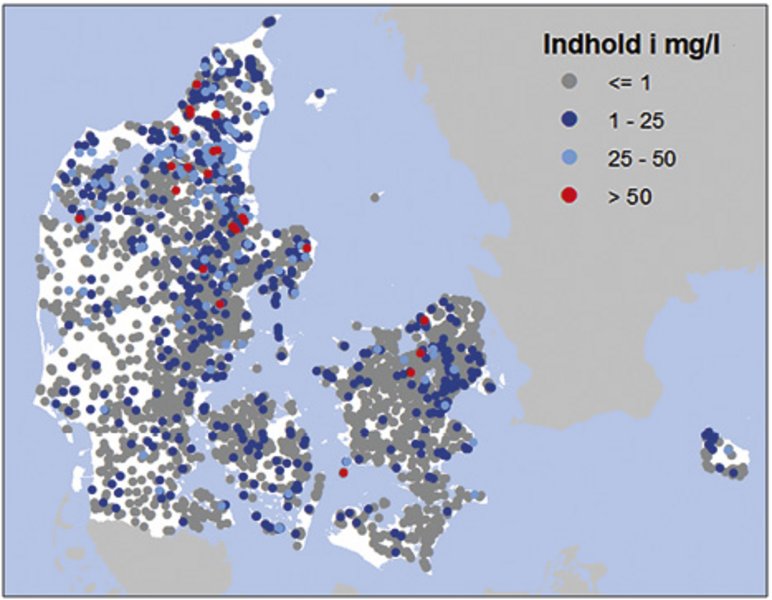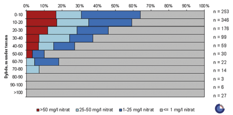I perioden 2020-2022 varierede nitratindholdet i det unge iltede, terrænnære grundvand landet over med 41% under 1 mg/liter, 15% over 50 mg/liter og resten herimellem. Vandværkerne derimod pumper fra ældre, dybereliggende grundvand, som er mindre forurenet, fordi intensiv gødskning og pesticidanvendelse er et nyere fænomen, og fordi nitrat under vandets nedsivning til stor jorddybde til dels fjernes af bakterielle og kemiske processer (se faktaboks).