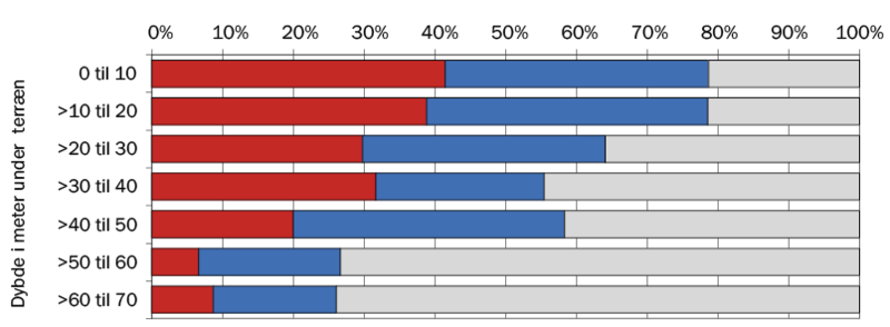 Status for den nationale monitering af grundvand for 2020-2022 afslører pesticider i 68 % af 1049 prøver analyseret mindst én gang i de tre år. Grundvandet er med andre ord forurenet med pesticider langt de fleste steder. Vi har fejlet stort med at holde grundvandet rent, og problemerne stiger og stiger. Grænseværdier for enkeltstoffer på 0,1 μ/L overskrides i 33 % af prøverne, og 13 % overstiger grænseværdien på 0,5 μ/L for summen af stofferne. Som forventet siver pesticiderne mod større jorddybder og ældre grundvand, idet grænseværdien for enkeltstoffer overskrides i 40 % af grundvandet fra 0-20 m og 7% fra 50-70 m i jorden (figur 3).