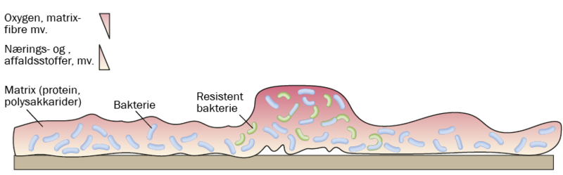 Tykkelsen af en biofilm er typisk få til hundrede mikrometer, og der skabes gradienter gennem laget. Yderst er der mest oxygen og næring, mens der inderst er mindst. Det vil sige, at der gennem filmen bliver dannet forskellige lag, hvor forskellige bakterier kan udskære sig sin egen niche.