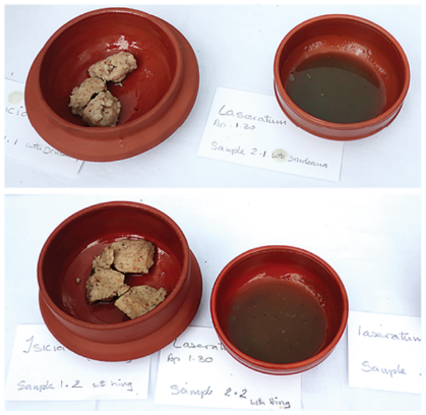 Vores britiske samarbejdspartner Sally Grainger brugte i sit eget rekonstruerede romerske køkken en opskrift fra Apicius som grundlag for sine smagseksperimenter: Silphium-sauce: “Man opløser en kyrenæisk eller parthisk laser (silphium) i varmt vand blandet med eddike og liquamen (fiskesauce).”