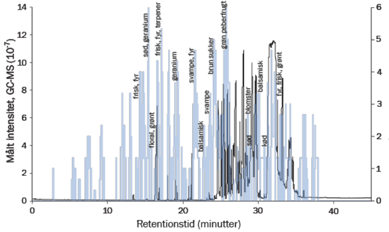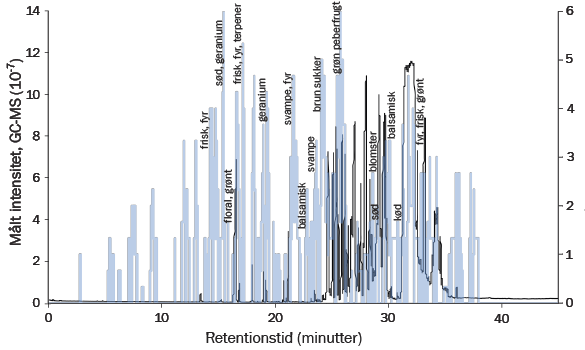 Når vi i laboratoriet vil identificere, hvilke aromastoffer der findes i forskellige præparater i harpiksen, foregår det som vist på figuren. Aromastofferne fra en prøve sendes på gasform gennem en gaskromatograf (GC), som gør det muligt at adskille aromastoffer i prøven og efterfølgende identificere dem ved hjælp af massespektrometri (MS). Dette sker samtidig med, at en person sniffer til stofferne, efterhånden som de kommer ud af kolonnen. Resultatet fra GC-MS er et såkaldt kromatogram, og resultatet af personens registrerede lugtindtryk og deres intensitet præsenteres i et såkaldt olfaktogram.