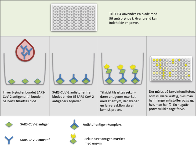 Til at måle antistoffer i blodet anvendes som oftest en såkaldt ELISA-test, som står for Enzyme-Linked Immunosorbent Assay. Til ELISA anvendes plader med 96 små brønde, som derfor kan teste mange prøver ad gangen. I modsætning til antistof-hurtigtesten kan en ELISA måle mængden af antistoffer til stede i blodet og derfor give et kvantitativt svar på, hvor kraftigt et immunrespons, der har været mod SARS-CoV-2 virussen. Hvor kraftig immunresponset har været vil også give en indikation af, hvor godt man er beskyttet fremover. Høj respons vil som hovedregel betyde bedre beskyttelse.