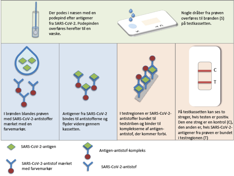 Prøven tages ved en podning i næsen og podepinden mikses med en væske, så prøven overføres til væsken. Herefter overføres et par dråber til en brønd på en testkassette, og efter 15 minutter kan svaret aflæses. Hvis der er SARS-CoV-2 antigener tilstede, vil det frembringe en farvet linje i aflæsningsvinduet. Er testen forløbet korrekt, skal der altid fremkomme en sekundær farvet linje som kontrol (se figur).