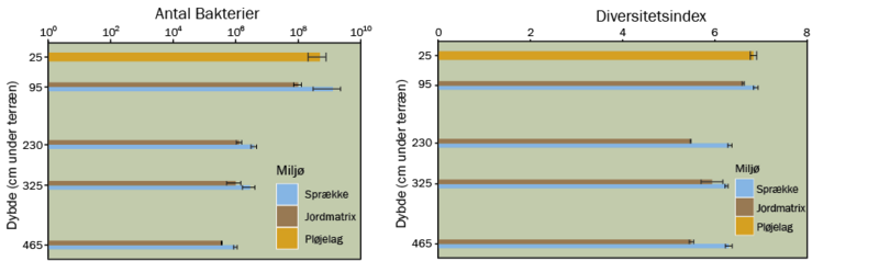 Antallet af bakterier ned gennem jordprofilen er målt ved at “tælle” antallet af et specifikt gen, som findes i alle bakterier, og som koder for en vigtig komponent (kaldet 16S ribosomalt RNA) i det maskineri, der oversætter gener til proteiner i cellen. Diversiteten af bakterier er baseret på et indeks – kaldet Shannon-indeks – som inkluderer både antal arter og arternes forekomst. Jo højere Shannon-indeks, des højere diversitet for det givne bakteriesamfund.