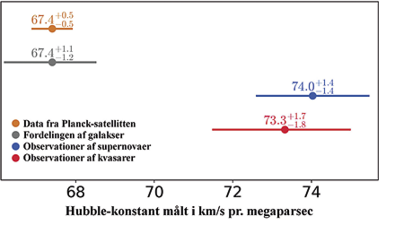 Når astronomerne måler afstanden til og hastigheden af supernovaer – ekstremt lysstærke eksploderende stjerner – får de en Hubble-konstant på cirka 74 (km/s)/Mpc. Tilsvarende målinger af andre fjerne himmellegemer giver nogenlunde samme resultat. Men når Hubble-konstanten findes ved at analysere den kosmiske baggrundsstråling eller de mønstre i fordelingen af galakser, der skyldes udbredelsen af lydbølger i det tidlige univers (baryoniske akustiske oscillationer), fås en noget lavere værdi på cirka 67,4 (km/s)/Mpc.