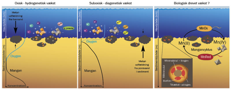 De fleste manganknolde fundet i Clarion-Clipperton brudzonen viser vækstlag af forskellig oprindelse og væksthastigheder. Knoldene tilføres ikke kun metaller fra havvandet, men kan også vokse ved at adsorbere metaller, som frigives i iltrige sedimenter umiddelbart under knoldene ved mikrobiel nedbrydning af organisk stof.