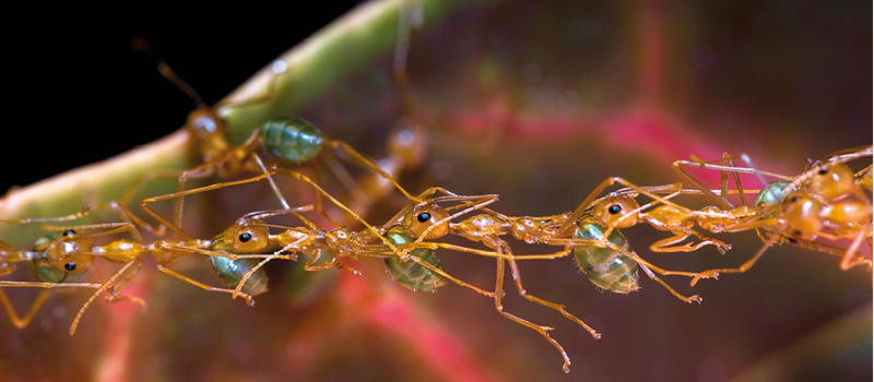 Når vævermyrerne skal samle blade, skal mange ting gå op i en højere enhed. For det første er myrerne nødt til at samarbejde for at trække bladene på grenene sammen. Det sker ved, at myrerne laver lange levende broer mellem grenene, og så forkorter de hele tiden broerne, indtil bladene er trukket sammen.