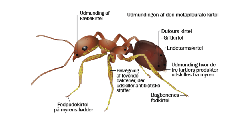 Derfor har myrerne også udviklet deres eget bredspektrede antibiotika, som bliver udskilt fra særlige kirtler på myrens krop. Dertil kommer, at myrerne også dyrker bakterier på deres kroppe, og disse bakterier producerer ligeledes et antibiotikum, der slår andre bakterier og svampesygdomme ihjel.