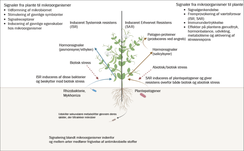 ISR opstår som følge af plantens lokale vekselvirkning med rhizobakterier ved rødderne – en vekselvirkning der er til fordel for både planter og mikroorganismer. SAR er en forsvarsstrategi, hvor et lokalt angreb af en patogen på for eksempel blade, resulterer i beskyttelse af hele planten mod efterfølgende angreb. Hormonsignalering spiller en vigtig rolle i begge strategier. Jasmonsyre spiller således en vigtig rolle i signaleringen i plantens reaktion på planteædere og sår, mens ethylen spiller en nøglerolle for planternes vækst og udvikling og er en vigtig stressregulator. Salicylsyrer er involveret i forsvarsreaktioner på skadevoldende organismer og er med til at inducere planteforsvar mod både biotiske og abiotiske belastninger gennem morfologiske, fysiologiske og biokemiske mekanismer.
