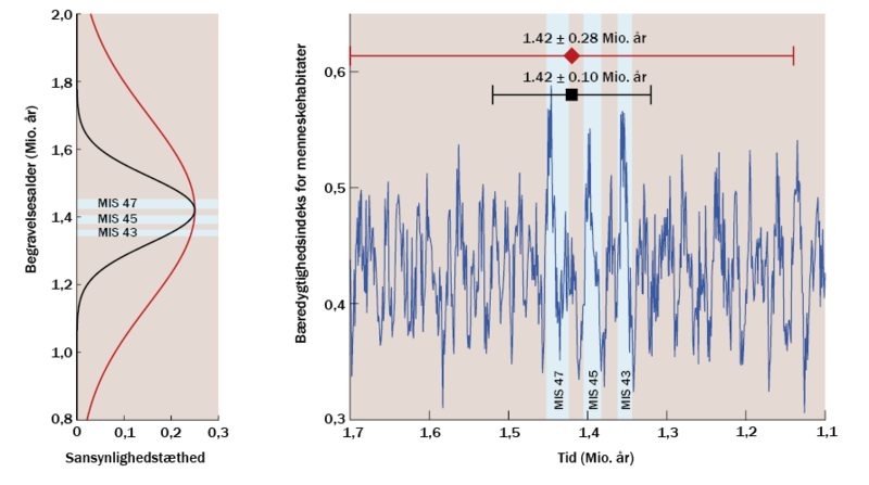 Enheden på 1.-aksen (sandsynlighedstæthed) er et mål for de angivne aldres sandsynlighed, og det fremgår, at begge modeller har toppunkt ved 1,4 millioner år, men P-PINI indrammer denne alder med større præcision. De tre blå linjer kaldet (MIS 43, 45 og 47) repræsenterer tre korte mellemistider.