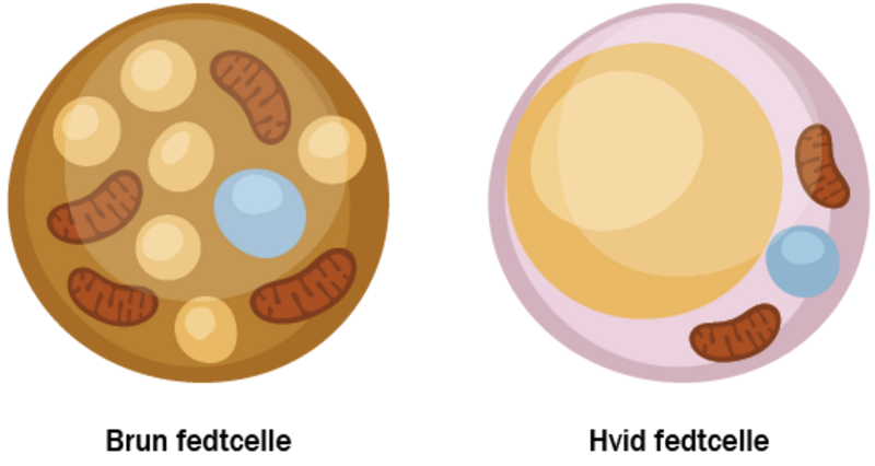 Illustration af forskellen på hvide og brune fedtceller. Begge typer ophober fedt i form af triglycerider, men mens den hvide fedtcelle ophober fedtet i en “samlet” pakke, er det i en brun fedtcelle fordelt rundt om i cellen. Det medfører strukturelle forskelle på de to typer celler i forhold til placering af cellekerne og organeller. Derudover er der mange flere mitokondrier i brune fedtceller, hvilket er det, de giver den brune farve.