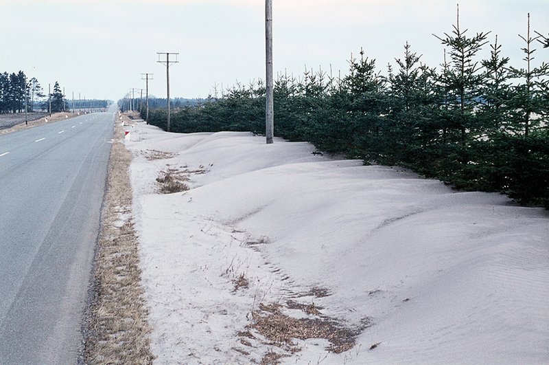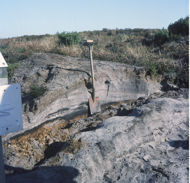 Et snit gennem et lavt sandflugtsdige på Harrild Hede. Her ses, hvordan gråt flyvesand er aflejret oven på den gamle podzol jordbund (ses nederst med et sort morlag umiddelbart over). Lige bag spaden ses mørke striber af morlag, der tolkes som afskårne lyngtørv lagt ovenpå hinanden. Flyvesand er derefter episodisk føget på, af vind fra venstre imod højre, inden der til slut er opstået en stabil overflade med hedelyng. Foto fra 1973 taget af Kristian Dalsgaard.
