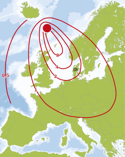 Kortet viser den omtrentlige udbredelse og tykkelse (i meter) af askelag i Nordvest-europa. Asken kom fra vulkaner i riftzonen ved dannelsen af Nordatlanten for cirka 56 millioner år siden. Dengang var Danmark et havområde og asken blev aflejret på havbunden.