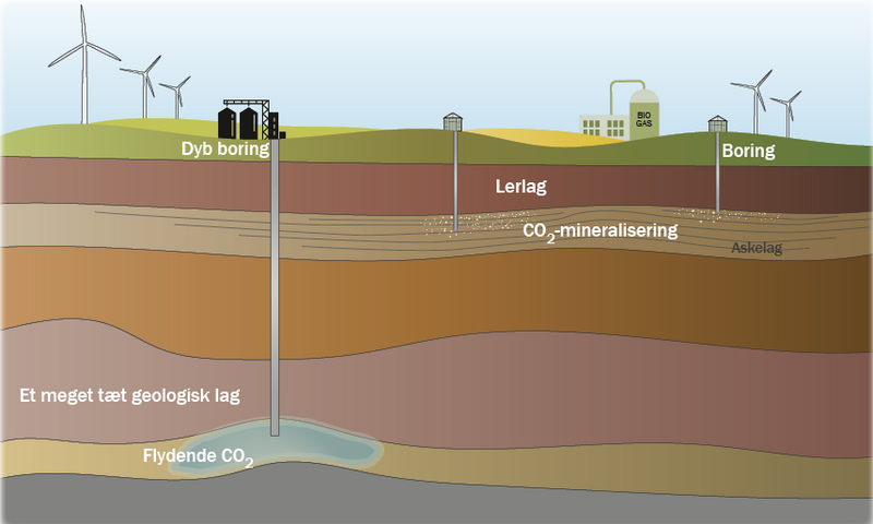 Netop når det kommer til at mineralisere CO2 og binde det i undergrunden, er der flere muligheder for at hjælpe naturen på vej, og i den sammenhæng skal vi kigge dybt under Jorden i blandt andet Danmark. Mellem 200 og 300 meter nede i den danske undergrund ligger flere hundrede tynde lag af vulkansk aske. Asken indeholder store mængder grundstoffer, der kan binde CO2 i mineraler. Kan man bringe CO2 og vulkansk aske sammen, åbner det op for muligheden for at binde store mængder mængder CO2 dybt nede i Jorden og dermed fjerne det permanent fra atmosfæren.