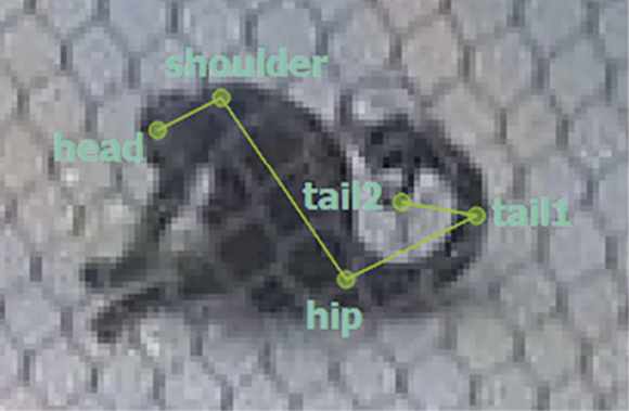 Dernæst prøvede vi et program, der hedder SLEAP (Social LEAP Estimates Animal Poses). Det fungerer lidt som at lave et digitalt skelet af dyret: Vi markerer nøglepunkter som hoved, ben og hale og forbinder dem med streger. Når vi har skelettet, kan vi se, hvordan dyret bevæger sig, og ud fra afstanden mellem punkterne kan man regne ud, hvilken type adfærd dyret har.