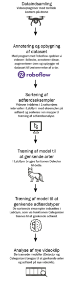 Vi valgte til sidst at bruge programmet LabGym. Det er et program, der egentlig er udviklet til at analysere adfærd hos laboratoriedyr, men vi opdagede, at det også fungerer rigtig godt til droneoptagelser. Programmet kan registrere dyrets omrids, og når det er trænet, kan det også genkende, hvad dyret laver. Det sker ved hjælp af billedgenkendelse og segmentering, som betyder, at LabGym kan “se” og kategorisere adfærden via dyrets omrids.