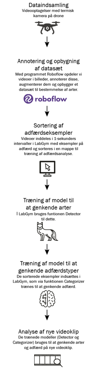 For at løse det problem har vi trænet kunstig intelligens til at genkende adfærd hos dyr som ræv og grævling i videoklip optaget med termiske droner. Det er ikke helt nemt, for dronen bevæger sig hele tiden og filmer fra forskellige vinkler og med forskellig zoom i modsætning til et fast kamera i en zoologisk have.