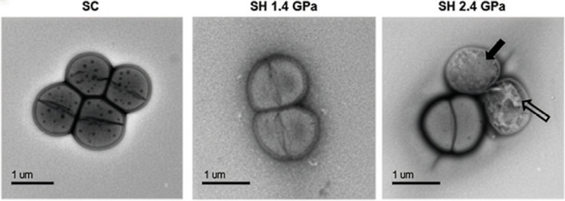 På billederne ses bakterier udsat for forskellige tryk (bakterierne til venstre er en uforstyrret kontrolgruppe). Pilene peger på henholdsvis indre skader (åben pil) og skader på cellemembranen (sort pil).