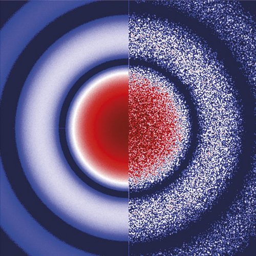 For uordnede materialer er opgaven imidlertid langt mere kompliceret. Almindelig røntgendiffraktion mister faktisk noget information, fordi røntgenbølgerne ikke er helt i takt. I ordnede krystaller betyder dette ikke meget, men i uordnede materialer som glas og væsker bliver det et grundlæggende problem. For at bevare informationen om den uordnede struktur har vi brug for perfekte røntgenbølger, der er helt i takt. Forskere kalder dette “kohærente røntgenstråler”, hvor bølgerne er i fase med hinanden. Det betyder, at bølgetoppene og bølgedalene falder sammen i tid og rum, og at de svinger med samme frekvens og i samme retning. Med sådanne røntgenstråler kan man opnå billeder, der, selvom de ligner tilfældige kornede prikker (se figuren herunder), faktisk er fingeraftryk af atompositioner i det virkelige rum. Kort sagt er kohærente røntgenstråler den nøgleingrediens, der gør det muligt at bygge et kamera, der kan afsløre de skjulte atomarrangementer i uordnede materialer.