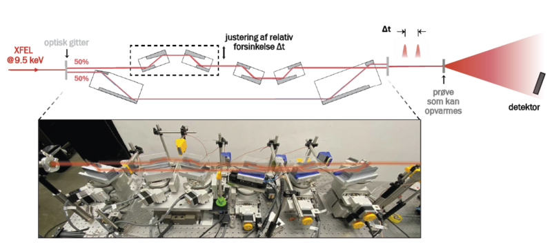 Forskere har brugt årtier på at udvikle optik til at opnå netop dette, hvilket absolut ikke er trivielt. Ideen er at bruge spejle til at splitte en røntgenpuls i to tvillingepulser og lade dem rejse ad to forskellige stier. Den ene rejser en lidt længere vej end den anden, og det betyder, at denne puls bliver forsinket i forhold til den anden. Efter denne rejse bliver tvillingepulserne kombineret igen for at vekselvirke med materialet – den ene efter den anden med en lille tidsforsinkelse imellem. Denne geniale idé gør det muligt for forskere nøjagtigt at kontrollere tidsforskellen mellem ankomsten af pulserne ved præcist at justere de stier, de rejser.