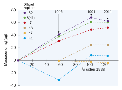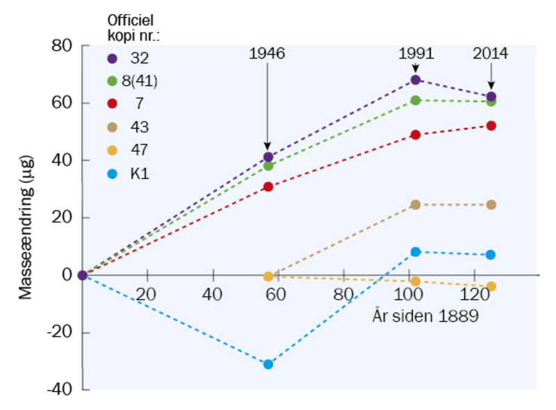 Forvirringen blev ikke mindre af, at IPK ikke blev ved med at have samme masse som kopierne. Der var en klar tendens til, at kopierne stille og roligt blev tungere, eller også blev den internationale prototype lettere. Ved den seneste sammenligning (kalibrering) i 2014 blev der målt udsving på op til 60 mikrogram. Forskellene blev umulig at ignorere.