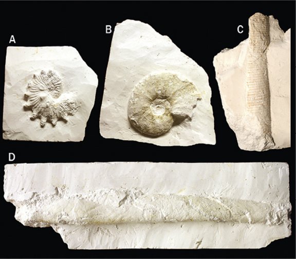 Typiske ammonitter fra Kridttiden fundet ved Stevns Klint. De nævnte navne er slægtsnavne – en slægt rummer typisk flere forskellige arter. Vi ved nu, at slægterne Hoploscaphites og Baculites samt Fresvilia faktisk overlevede katastrofen på grænsen mellem kridttiden og palæogentiden.