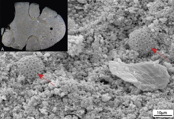 Billede taget med scanning-elektronmikroskop af kalken inde i skallen af et eksemplar af ammonitten Baculites (øverst til venstre ses et poleret tværsnit af skallen). De røde pile peger på eksemplarer af dinoflagellaten Cervisiella operculata, som er et typisk mikrofossil i Cerithiumkalken, men ikke findes i lag fra kridttiden.