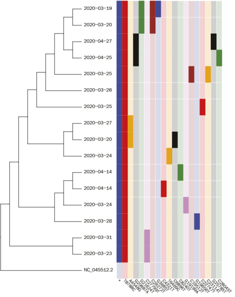 Hvis man antager, at én mutation i genomsekvensen på et sted er lige så sandsynlig som en mutation ethvert andet sted, kan man konkludere, at mutationen T8788C er sket først. Dernæst kom mutationen G20887A, som så igen forgrener sig ud i henholdsvis C28045T og G25785T. Vi kan altså direkte aflæse den sandsynlige smittekæde: