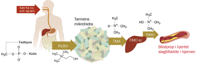 Er man til gengæld forfalden til burgere og pomfritter, har svært ved at få snøret løbeskoene, er lidt for glad for alkohol og ikke har fået lagt smøgerne på hylden endnu, fremmer man væksten af bakterier og andre mikrober, som man ikke har lyst til at have i kroppen. Eksempelvis stimulerer et stort og hyppigt indtag af kød fra firbenede dyr som svin og okse væksten af helt andre typer af bakterier, der producerer nogle ret så uheldige stoffer. Ud fra L-carnitin og fosfatidylkolin i kødet producerer disse bakterier blandt andet trimetylamin, som i leveren omdannes til trimetylamin-oxid. Dette stof kan lede til åreforkalkninger på samme måde som det usunde LDL-kolesterol.