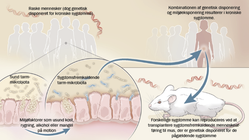 Blandt andet har forsøg vist, at hvis man tager afføring fra mennesker, der har kronisk tarmbetændelse, fedme eller lider af autisme, skizofreni eller depression, og overfører den til mus eller rotter, der ikke har bakterier i tarmene, vil forsøgsdyrene udvikle lignende sygdomsspecifikke træk. Det peger på, at ubalancer i tarmmikroberne og de molekyler, som de uønskede mikrober danner, kan bidrage til, at sygdommene opstår hos dyr med genetisk disposition, der minder om den genetiske disposition for de folkesygdomme, vi ser hos mennesker.
