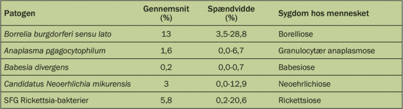 Tabellen viser andelen af flåtnymfer, der er inficerede med forskellige patogener i Norge, Sverige og Danmark. Denne Infektionsprocent afhænger meget af vejr- og jordbundsforhold samt af, hvilken vegetation og hvilke dyr, der findes på de lokaliteter, hvor flåterne er indsamlet. Tabellen er baseret på udpluk fra forskningsartiklen Spatial patterns of pathogen prevalence in questing Ixodes ricinus nymphs in southern Scandinavia, 2016 af Kjær et al. 2020.