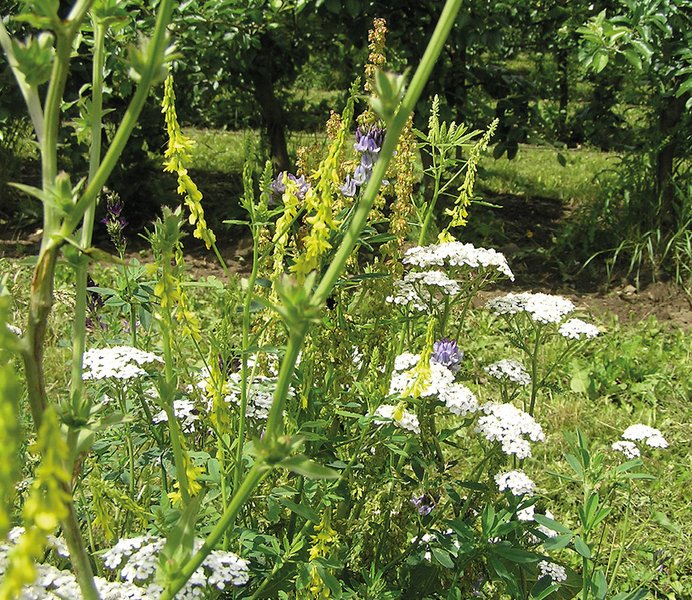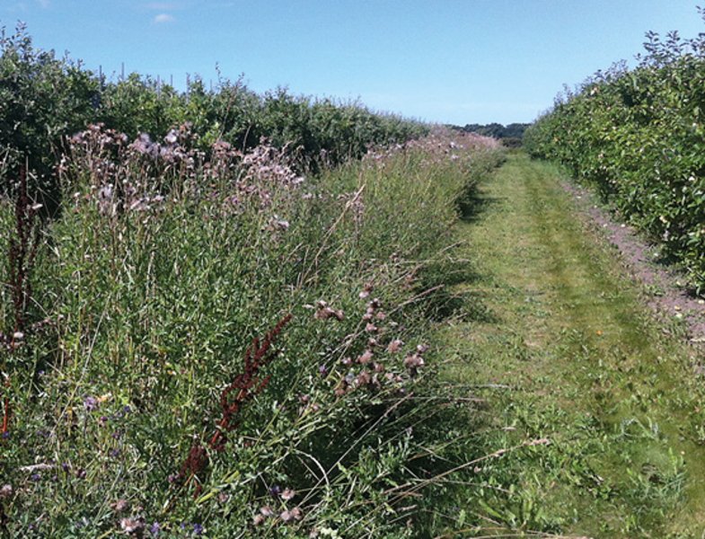 I forsøg i frugtplantager har vi brugt blandinger med 30-40 forskellige hjemmehørende arter, dertil også græsser, som er med til at gøre blomsterstriben mere robust. I forsøg i plantager i syv europæiske lande såede vi blomsterstriber mellem alle trærækker i halvdelen af en række økologiske æbleplantager, mens den anden halvdel blev dyrket normalt med græs mellem træerne. Vi fandt signifikant flere naturlige fjender og en nedsat skade fra bladlus og æblevikler i den del af plantagerne, der havde blomsterstriber.