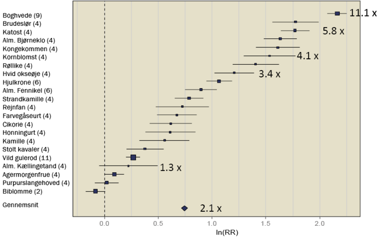 Grafen viser forskellen i rovinsekters levetid på blomster af forskellige plantearter i forhold til på vand. y-aksen viser plantearter, hvis værdi har været testet for rovinsekter (inklusiv rovmider). Tallet i parentes er antal studier udført.
