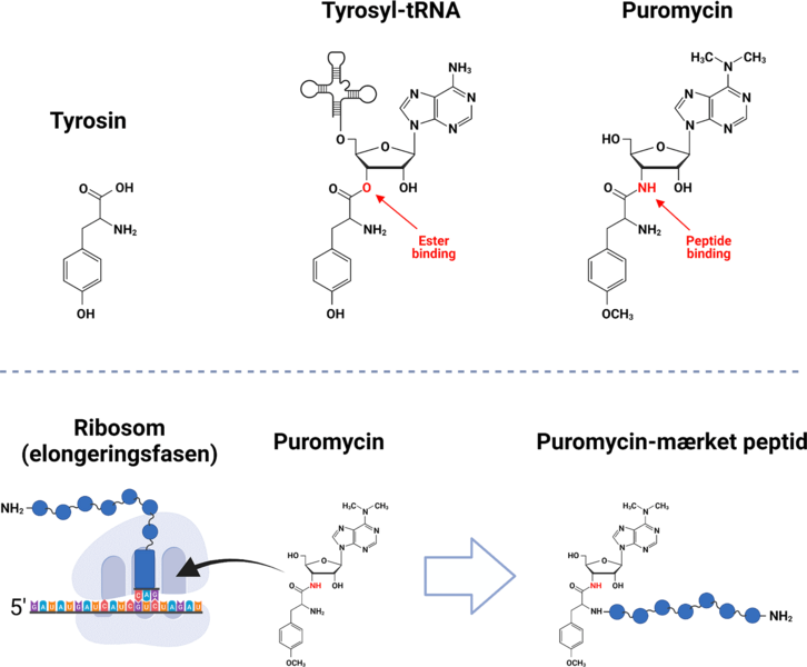 I forsøgene, der ligger bag de nye opdagelser, brugte forskerne et stof kaldet puromycin – et antibiotikum med en kemisk struktur, der er analog til et tRNA-molekyle bundet til aminosyren tyrosin. Når puromycin injiceres i slangens blodbane, vil det fordeles til alle væv og kunne indgå i elongeringsfasen af proteinsyntesen i stedet for en tyrosinbærende tRNA. Puromycin mangler imidlertid den tyrosin-bærende tRNA’s esterbinding og kan derfor ikke processeres som et normalt tRNA i ribosomet. Når puromycin binder sig til den voksende proteinkæde i stedet for tyrosin, resulterer det i en præmatur terminering af proteinsyntesen, hvorved den nu puromycin-mær-kede proteinkæde frigives fra ribosomet.