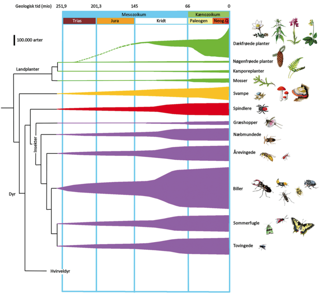 I de seneste 100 millioner år er der sket en eksplosion af landlevende dyr og svampe knyttet til blomsterplanterne. I runde tal omfatter navngivne landlevende arter op mod to millioner. Landjordens artsdiversitet er dermed cirka 5 gange større end den samlede artsdiversitet i ferskvand og havet. Langt den største hovedgruppe på land er insekterne med godt 1 million navngivne arter. Her er artstallet i de største hovedgrupper, biller (387.000), sommerfugle (158.000), fluer og myg (156.000), bier og myrer (117.000) samt tæger (104.000).