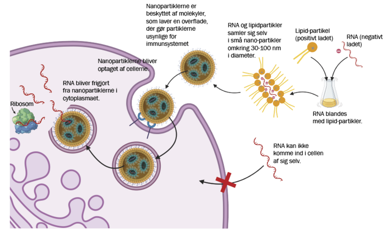 Lipid-nano-partiklerne fungerer på den måde, at de beskytter RNA’et, mens det flyder rundt mellem cellerne. På et tidspunkt smelter de dog sammen med cellemembranen og tømmer indholdet, hvilket vil sige RNA’et, ind i cellerne.